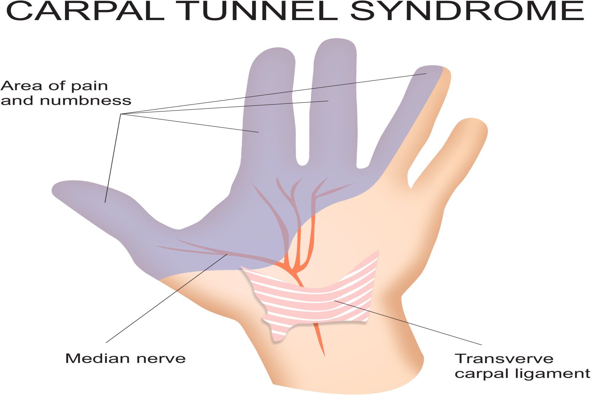 - Compression of the median nerve as it passes from the forearm into the hand through a passage called carpal (i.e. wrist) tunnel